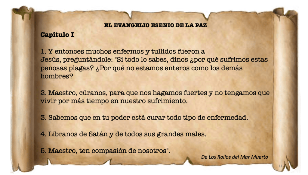 Los terapeutas naturales, ya sean naturópatas, quiroprácticos, o naturólogos tradicionales, están preparados para tratar las enfermedades que sufre la gente de forma natural, utilizando los siete remedios de la naturaleza en combinaciones espectaculares que se pueden catalogar como milagros modernos. Eso hacían los esenios o terapeutas naturalistas sanadores de su tiempo. Con ellos se reunía Jesús para enseñarle los secretos del Reino de los cielos relacionados a la salud, la naturaleza, y a la palabra de Dios que lleva a la salvación. Ellos escribieron el evangelio de La Paz en rollos de piel y tabletas de arcilla. Esos manuscritos fueron encontrados en Qumrán y en otras cuevas para 1930 y al enterarse de su existencia, el Dr. Edmond Bordeaux Szekely se interesó en saber qué contenían y de que se trataba el hallazgo. Al enterarse que fueron llevados a la Biblioteca del Vaticano, hizo todo lo posible por verlos, y allí los estudiosos, así como él, tradujeron lo que les pareció más interesante para el lector común. Veamos el caso que tenemos a mano: